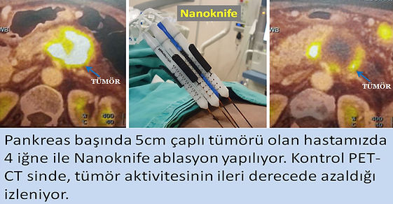 Pankreas kanserinde son yıllarda popüler olan bir diğer ablasyon tekniği de Nanoknife olarak bilinen geridönüşümsüz elektroporasyon (irreversible electroporation) yöntemidir. Bu yöntemde, pankreastaki kitlenin kenarlarına, ultrason ve tomografi rehberliğinde, 4-5 adet elektrod yerleştirilir ve elektrodlara sırayla kısa süreli ancak çok yüksek (3000 Volt, 50 Amper gibi) elektrik akımı verilir. Bu elektrik akımı, hücre duvarında kalıcı olarak bazı delikler açar (porasyon) ve duvar geçirgenliğini artırarak hücrenin ölümüne neden olur. Nanoknife ablasyonun en önemli özelliği, büyük damarların çevresindeki tümör dokusuna daha etkili olması ve damarlar, safra kanalları ve mide-barsak gibi kritik dokulara daha az zarar vermesidir. Bu nedenle, pankreas kanserinde umut veren bir yöntem olduğu düşünülmüştür. Nanoknife (IRE) tedavisi 2013-2015 yılları arasında ekibimiz tarafından yoğun olarak uygulanmıştır ve ekibimiz bu konuda radyoloji ve girişimsel radyoloji alanında peşpeşe 2 kez birincilik ödülüne layık görülmüştür.